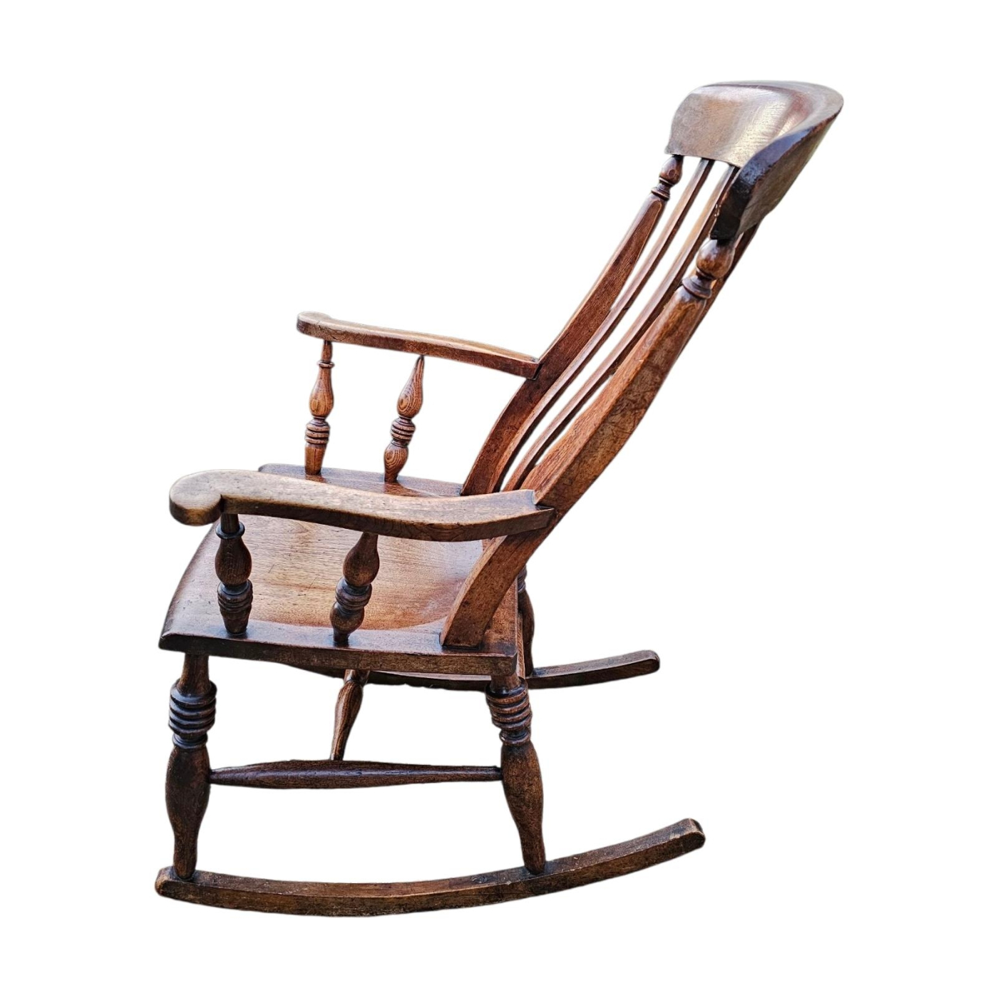 A 19TH CENTURY ASH AND ELM LATHE BACK ROCKING CHAIR