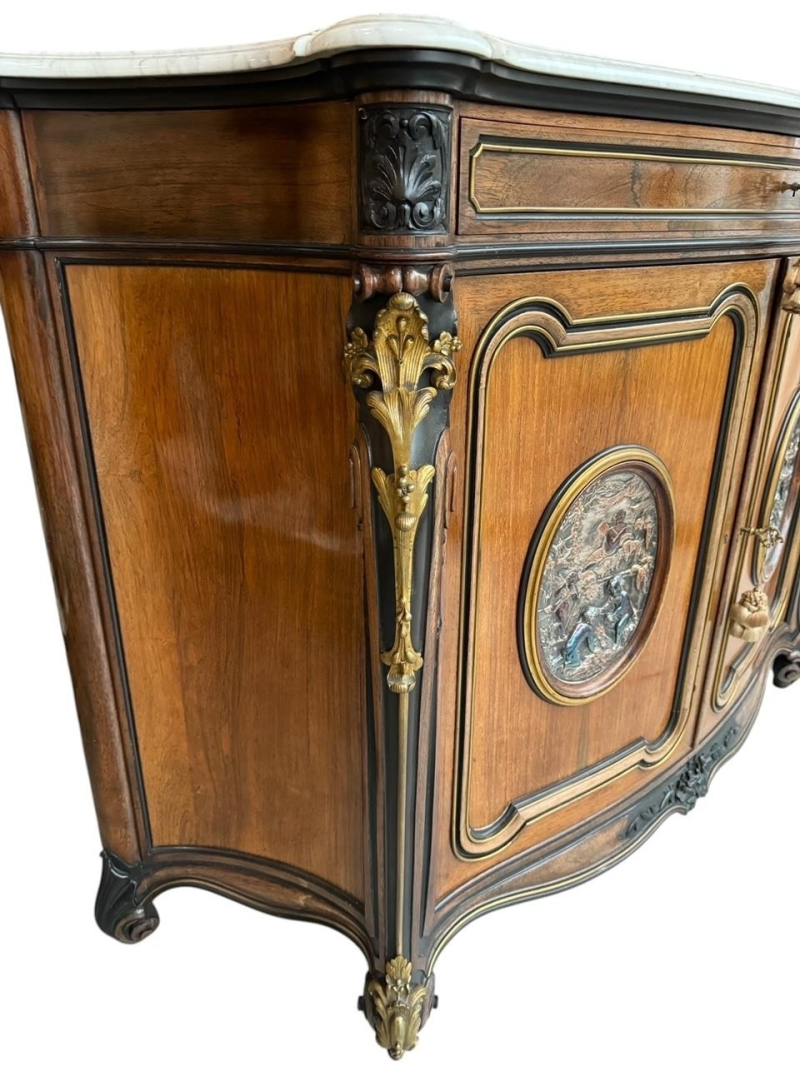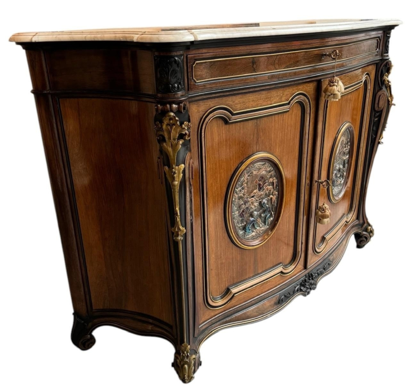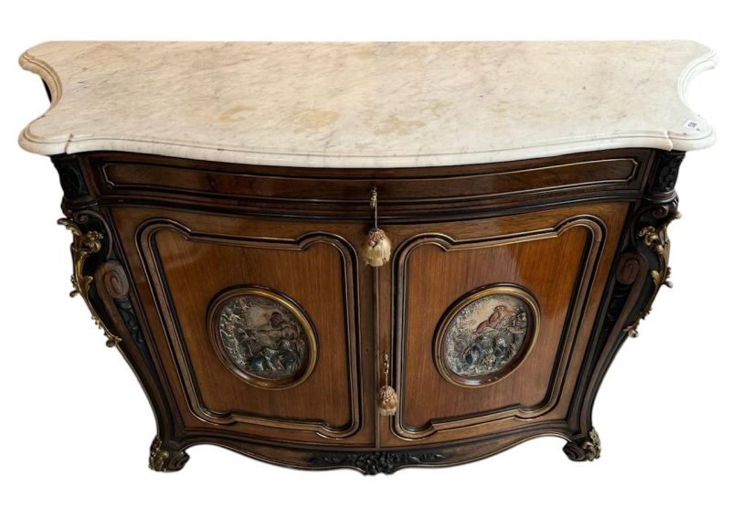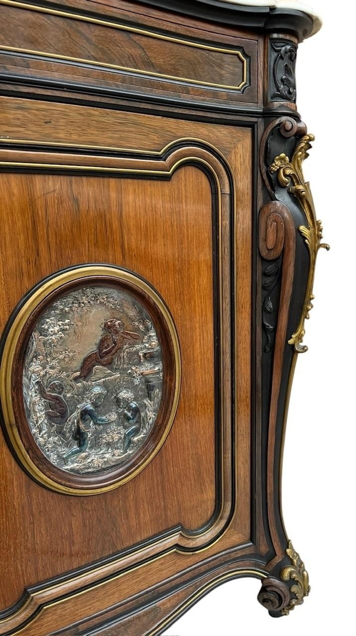 The serpentine marble tops above a single drawer and a pair of panelled doors set with oval silvered plaques decorated with putties in a landscape, above a shaped apron carved with flowerheads, raised on scrolling feet the plaques signed ‘CHRISTOFLE’, the back panel ink stamped ‘Guignard’, cabinets attributed to Grohé Frères.