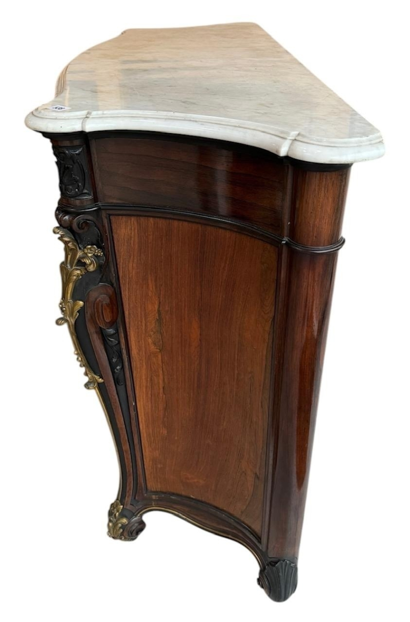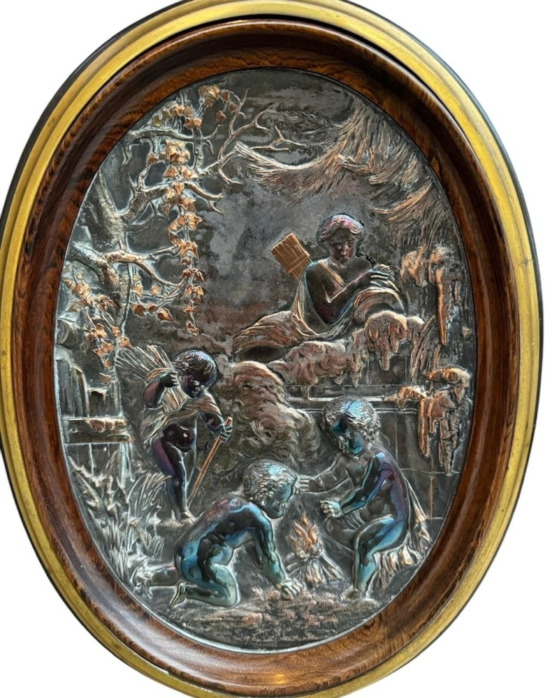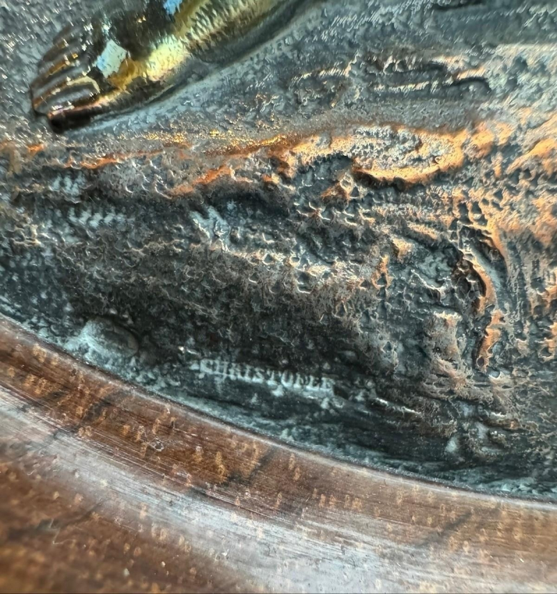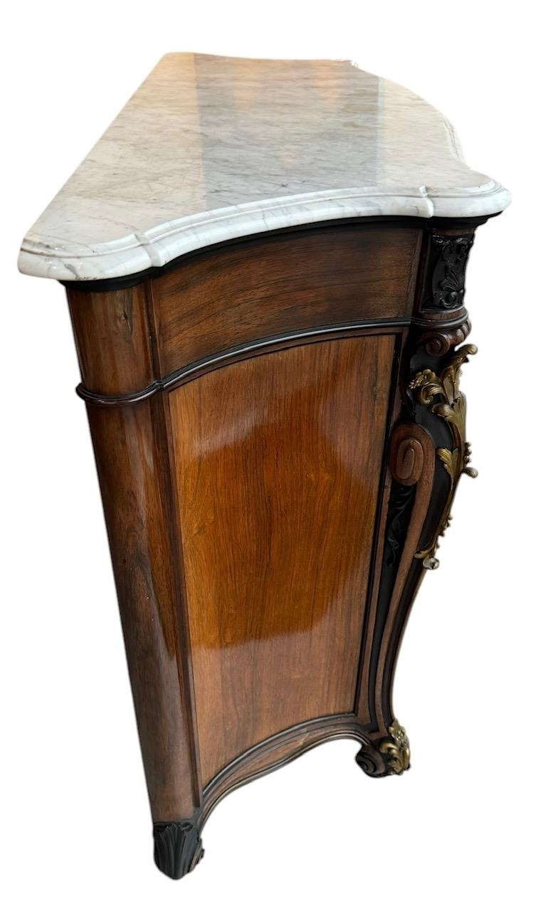 The serpentine marble tops above a single drawer and a pair of panelled doors set with oval silvered plaques decorated with putties in a landscape, above a shaped apron carved with flowerheads, raised on scrolling feet the plaques signed ‘CHRISTOFLE’, the back panel ink stamped ‘Guignard’, cabinets attributed to Grohé Frères.