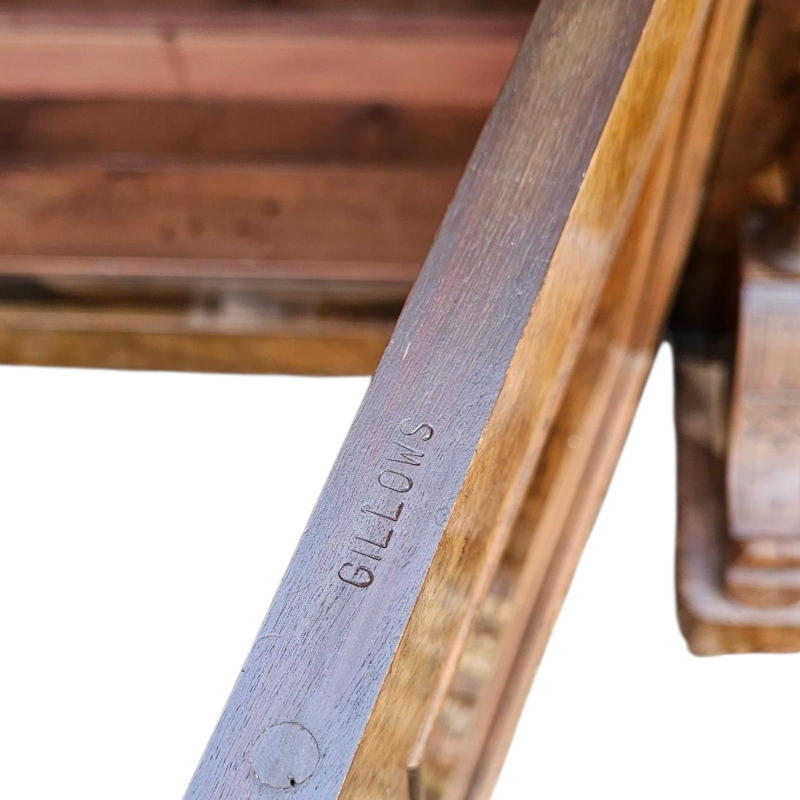 With gallery top above cupboards, drawers centralised with a pullout tooled leather surface, stamped ‘Gillow’.