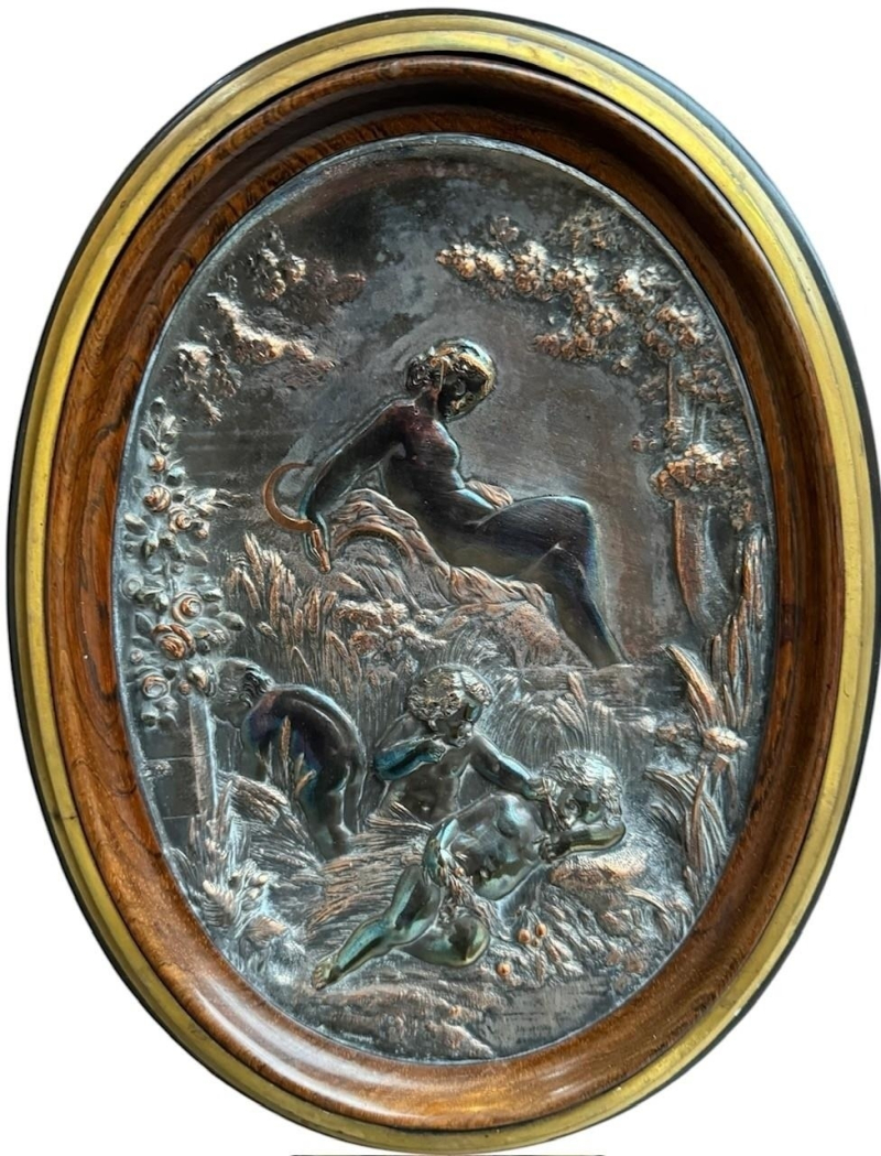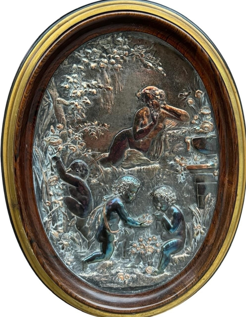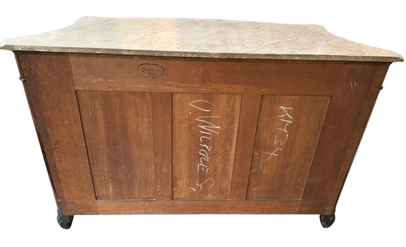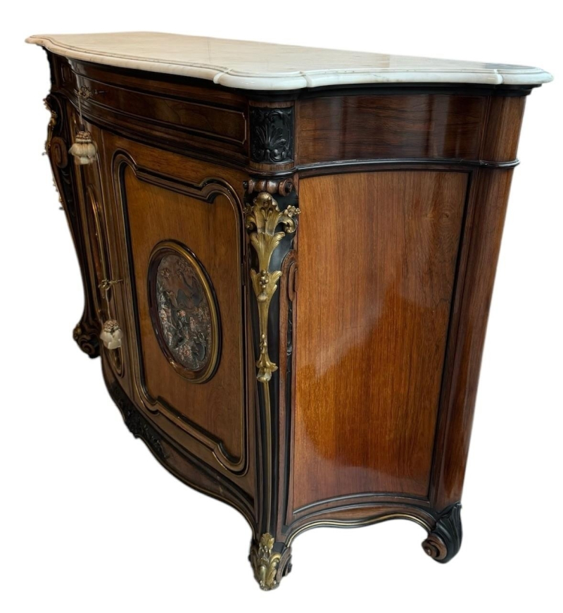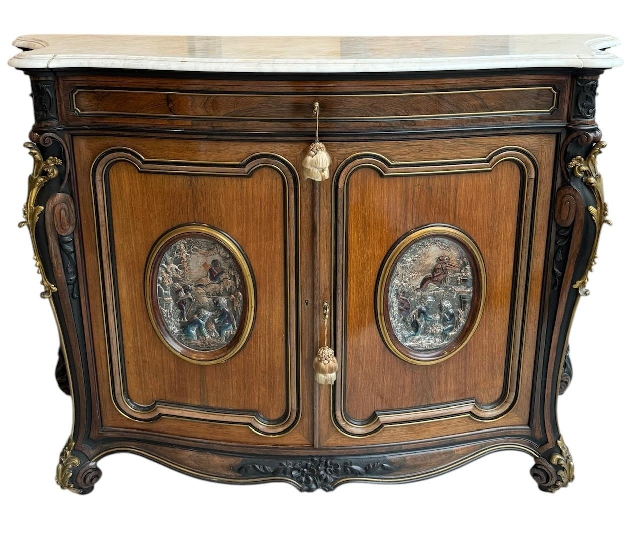 The serpentine marble tops above a single drawer and a pair of panelled doors set with oval silvered plaques decorated with putties in a landscape, above a shaped apron carved with flowerheads, raised on scrolling feet the plaques signed ‘CHRISTOFLE’, the back panel ink stamped ‘Guignard’, cabinets attributed to Grohé Frères.