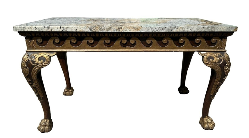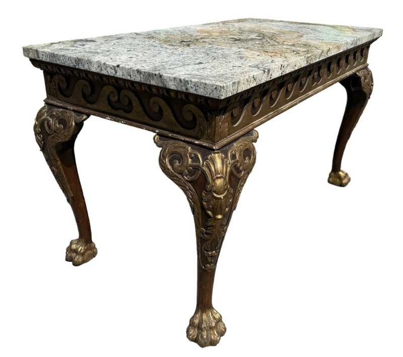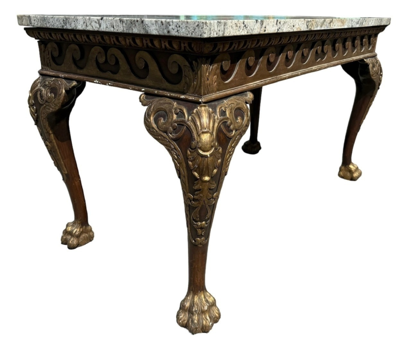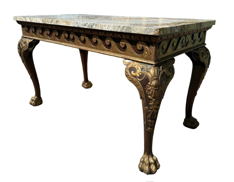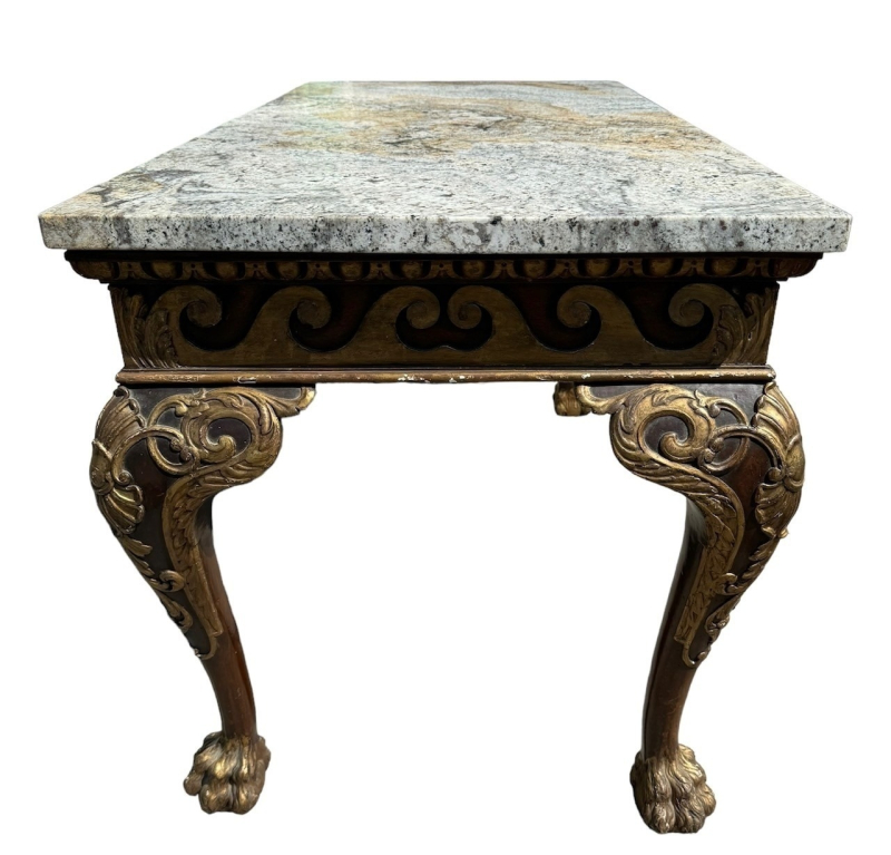 The coloured granite top above an egg and dart moulded top edge, over a Vitruvian scroll frieze with acanthus spray angles, raised on four acanthus scrolling leaf and shell decorated cabriole legs terminating on lion paw feet with hairy hocks.